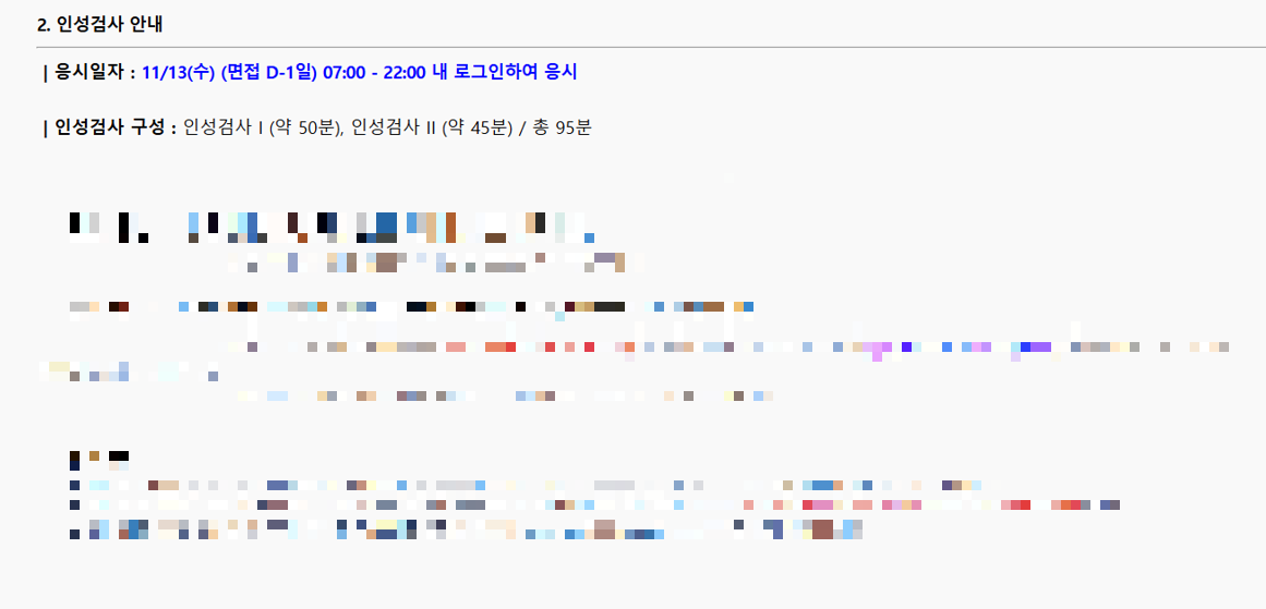 10월 21일 결과가 나온 이후, 1주일 뒤 면접 안내문이 게시되었습니다. 직무면접, 인성검사 전형 진행날짜(각각 11/14, 11/13) 및 각종 안내사항을 전달받았습니다.