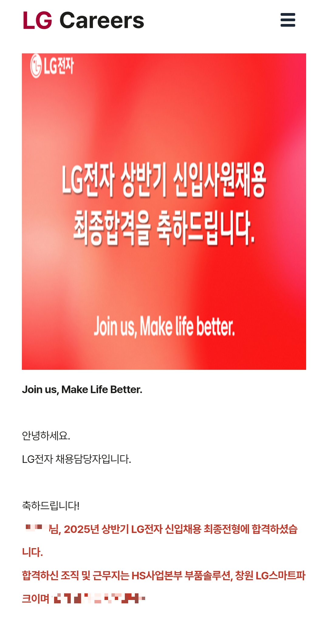 면접이 끝난 이후, 8일 뒤인 4/25(금) 오후 3시 반경, 문자가 왔고, LG Careers를 로그인 한 결과, 합격 메시지를 확인했습니다!! 마지막 학기가 끝나기 전에, 취업을 확정지을 수 있어서 정말 좋았습니다!!