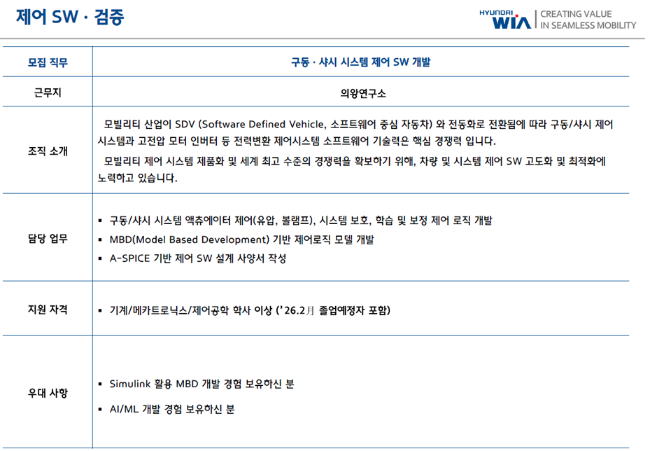 [2025 하반기] 현대위아 - 차량부품연구 - 제어 SW · 검증 - 구동/샤시 시스템 제어 SW개발 - (1) 서류전형