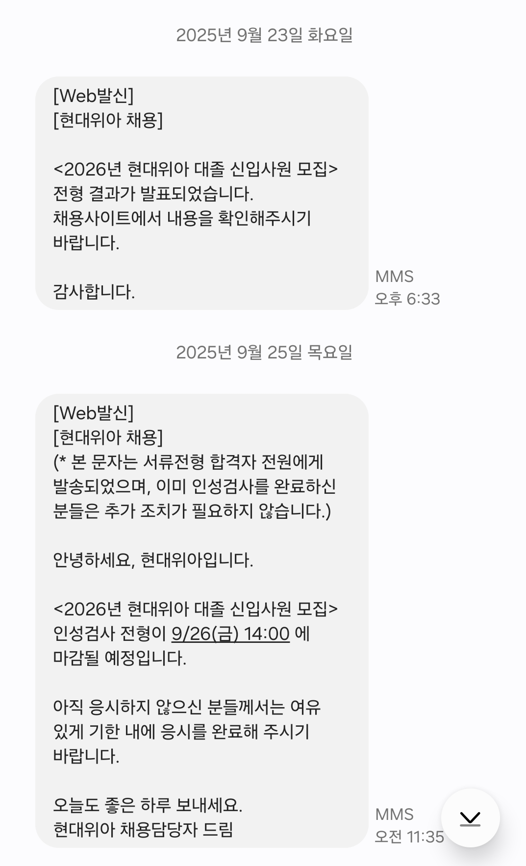 지원서를 제출한 이후, 공고가 끝난 8일 뒤 문자메시지와 메일이 도착했습니다.