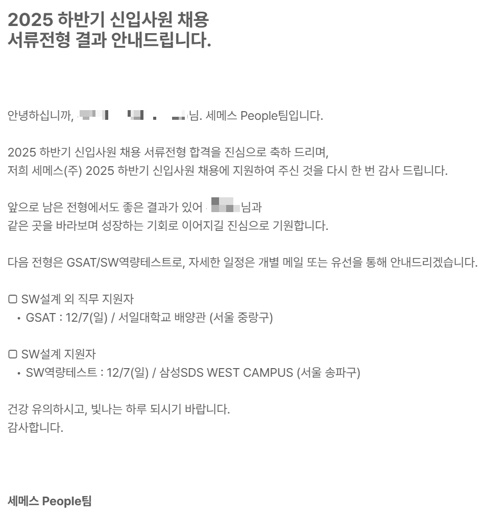 2025년 11월 4일 ~ 14일 까지 2025 하반기 세메스 신입사원 채용 공고가 올라왔습니다.