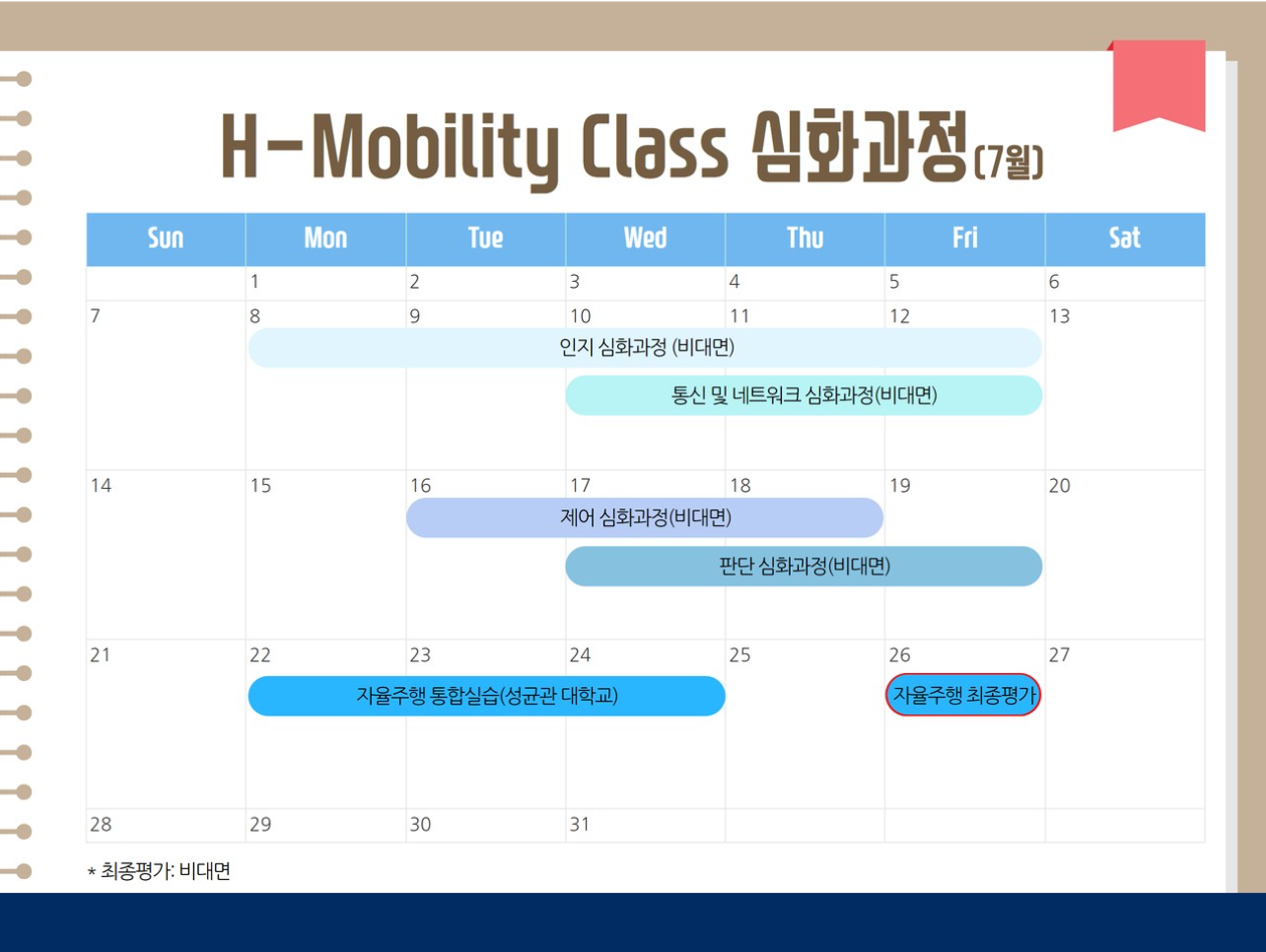 이제 심화교육에 대해서 말씀드리겠습니다. 앞선 일정에서, 인지/ 통신 및 네트워크/ 제어/ 판단 심화과정 네 가지 중에서, 가장 우수한 성적을 거둔 한가지 과정에 대해서 비대면으로 교육을 듣고, 이후 7월 22 -24일 자율주행 통합 실습을 성균관대학교에서 수행하는 일정입니다.